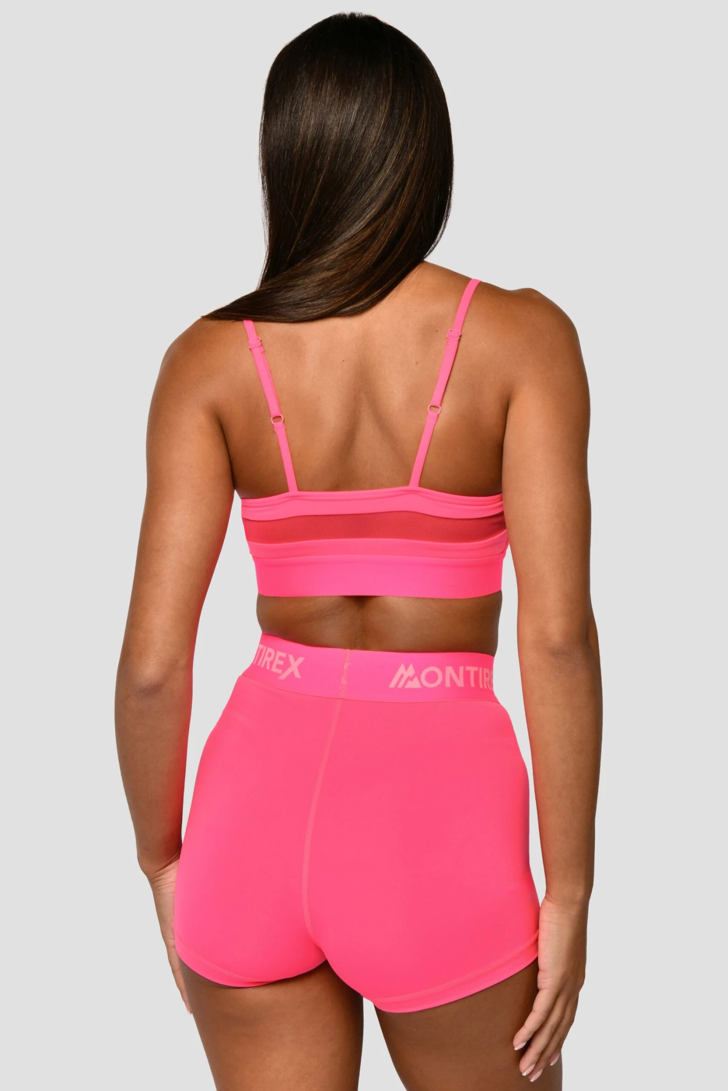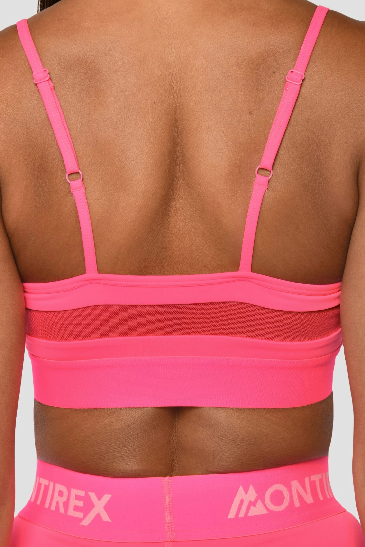 The Icon Strappy Bra in Neon Pink provides a standard fit for comfort and support during your workouts. The reflective logo ensures visibility in low light conditions, while the adjustable strappy back detailing and branded elasticated waistband add a stylish touch. The mesh back panel allows for added breathability.